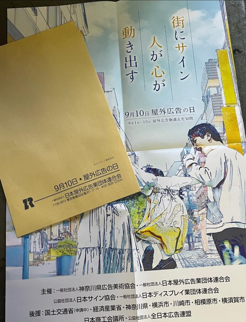 屋外広告の日キャンペーンポスター発送しました。 2023 8/24 お知らせ 2023-08-24 本日、会員の皆様宛に屋外広告の日のキャンペーンポスターを発送いたしました。お手元に届きましたら、事業所の目立つところに掲出をお願いいたします お知らせ この記事が気に入ったら いいねしてね! よかったらシェアしてね! URLをコピーしました! URLをコピーしました! 第4回 『神広美くん』と神広美(ややこしい!?)~②お仕事依頼編からの語り合い(という名の飲み会)編~ 理事会を開催しております。 関連記事 9/28:川崎技能フェスティバルが開催 2025-09-28 9月度の定例理事会が開催 2025-09-19 「横浜サイン展 巡回展」は横浜市内11か所の市営図書館で順次開催 2025-09-18 有志により、書き文字講習会「描」を開催 2025-09-14 9月10日屋外広告の日 2025-09-12 会長、マリンFMの「ヨコハマVoice Street」に出演 2025-09-12 9月10日:屋外広告の日に、末廣会長がマリンFMに出演 2025-09-04 屋外広告の日のキャンペーン 2025-09-04